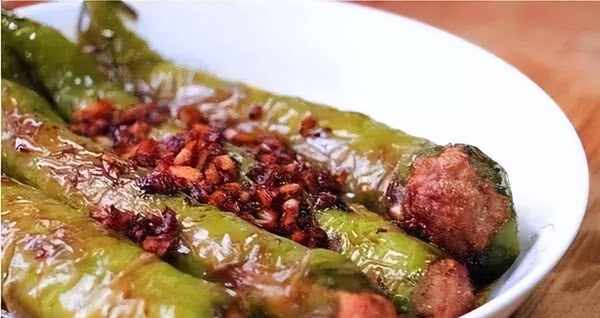 3、平底鍋熱油,將尖椒釀放入,兩面煎熟,即可!