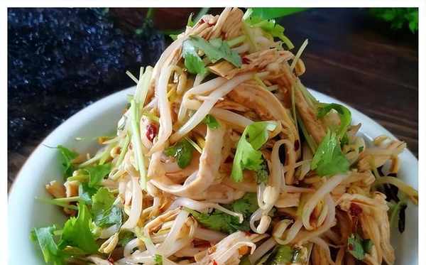 材料:雞胸肉1塊、綠豆芽250克、香菜2棵、鹽適量、辣椒油1湯匙、香油1湯匙、大蒜3瓣、蔥2段、薑3片、花椒10粒、大料1個,料酒1湯匙、白糖少許