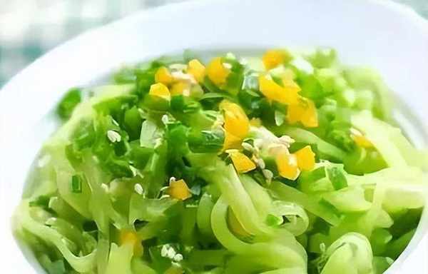 8.然後切成絲。加上一小勺鹽在萵筍絲裡再澆入萵筍絲上即可