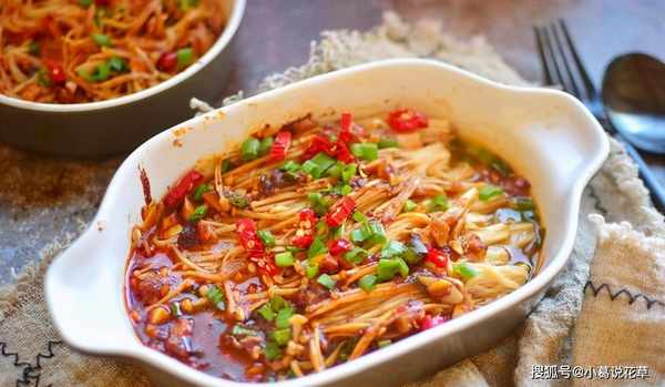 食材:金針菇400克、食用油20克、辣椒醬2勺、大蒜5瓣、蠔油1勺、鹽適量、生抽2勺、白糖1勺、小蔥適量、紅幹椒適量、燒烤料1包