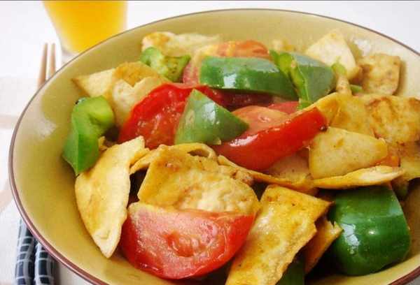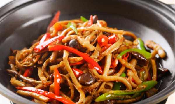 6、炒2分鐘左右,放入切好的青椒絲,再放適量雞精炒勻即可。
