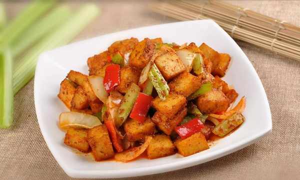 材料:豆腐300克,孜然,蔥,薑,鹽,生抽,幹辣椒,花生油