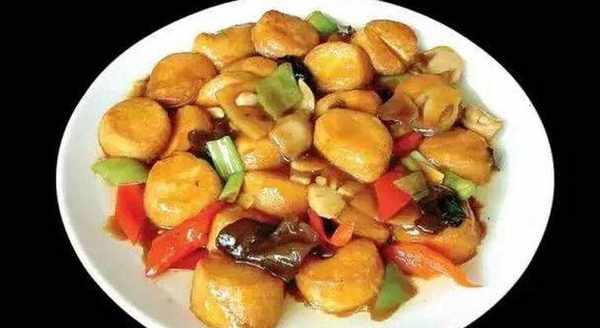3、香幹切小方塊,入油鍋煎至兩面金黃,然後油鍋燒熱,將雞肉放入鍋中炸至變色即可。