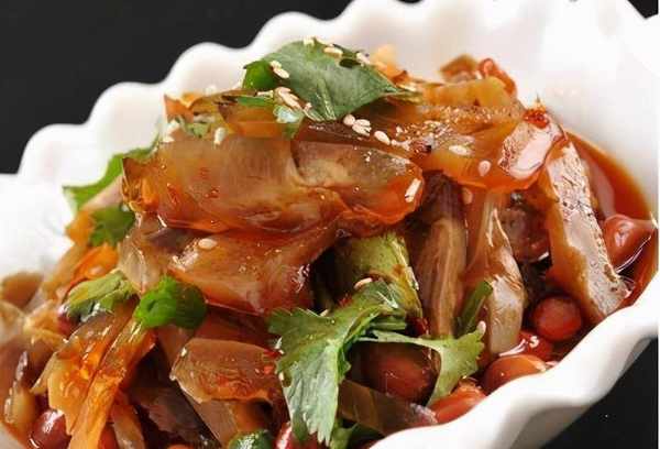做法:1、牛筋洗凈,放入高壓鍋,加適量水,蓋上蔥、薑片、八角,壓40分鐘,放氣撈出牛筋。