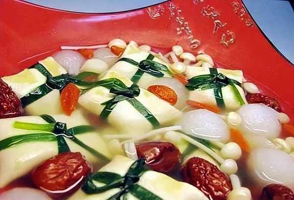 原料:腐皮少許、素肉碎2粒、紅棗8粒、貓蘿卜半根、金針菇1粒、枸杞少許、韭菜少許、素湯一碗;