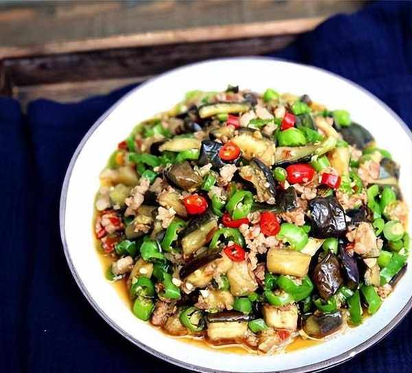 材料:茄子2個,青椒5個,豬肉300克,小米2粒。