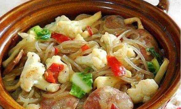 4、待菜花軟爛後,倒入粉絲炒勻,加入雞精調味;起鍋前加入適量蒜片和香蔥末提香即可出鍋。
