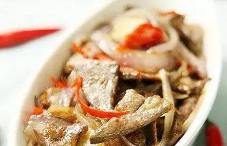 切洋蔥、辣椒、胡蘿卜和豬肝;豬肝洗白,水加少許薑末和熱酒,鍋裡油燒熱,放入蔥、薑、蒜,先將胡蘿卜下鍋炒熟,熟後放入洋蔥。十秒炒十多秒,將花椒放入鍋中,加少許水再炒十秒;洋蔥掰斷後,將豬肝倒入鍋中,翻炒幾下;生抽,炒勻,即可出鍋。