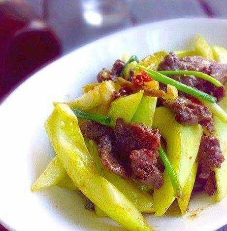 材料:白瓜、牛肉、蔥、朝天椒、蒜頭、薑、鹽、糖、蠔油、雞粉、酒、生抽、胡椒粉、生粉