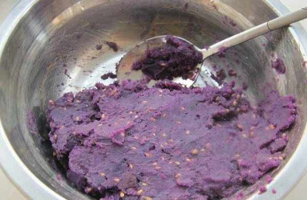 紫薯2個,清洗幹凈,削掉外皮,切成厚片,放在盤子上,水開上鍋蒸上20分鐘,蒸好後將其取出,放在盆中,放上點糯米粉,然後再放少許的清水,攪拌均勻成面團,