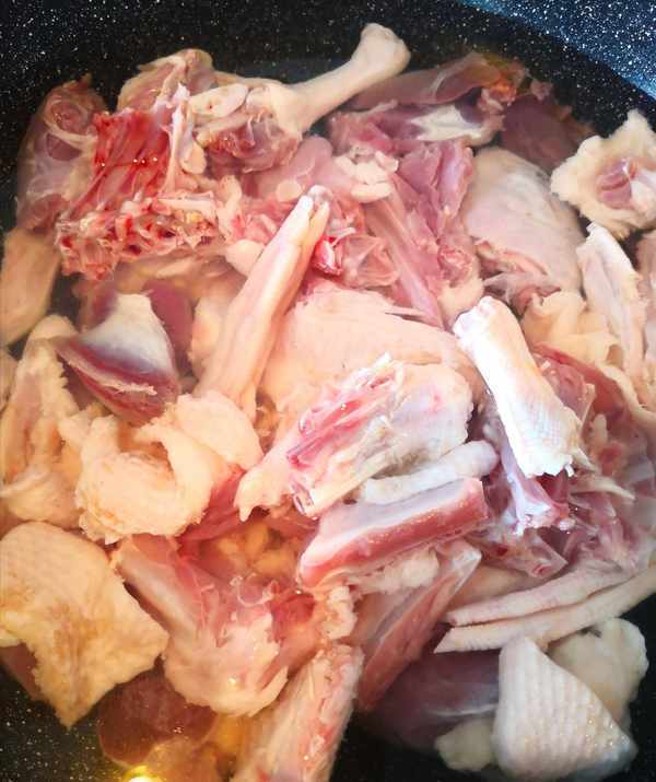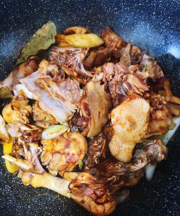 倒入鴨肉,加適量老抽,翻炒至鴨肉上色均勻。