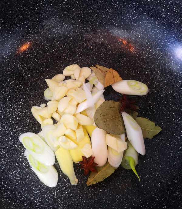 熱鍋涼油,少許油保證不幹鍋即可,因為鴨肉自帶油脂,如果加太多油成品會較油膩,很容易影響食欲,倒入蔥、薑、蒜、八角、香葉小火翻炒出香味。