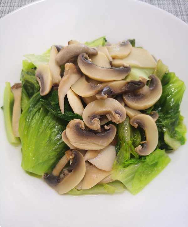 水開後倒入口蘑薄片、杏鮑菇薄片,煮約兩分鐘撈出控水;另起鍋,倒入少許油,倒入香蔥炒出香味,倒入生菜、蘑菇,加點鹽,翻炒至入味均勻即可。