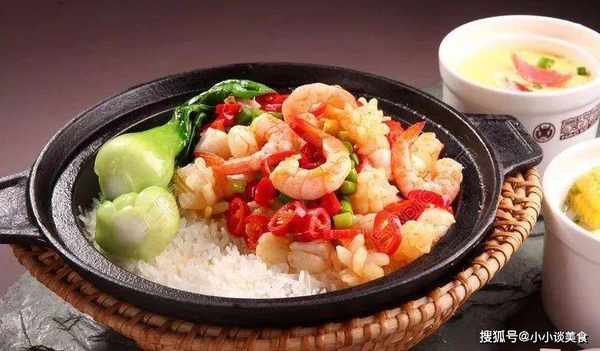 3、下所有調味料將青豆、青菜和蝦仁、幹貝旺火燒入味,盛在瓦煲的米飯上。