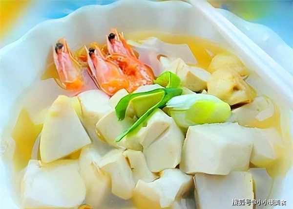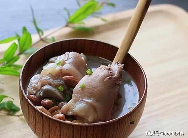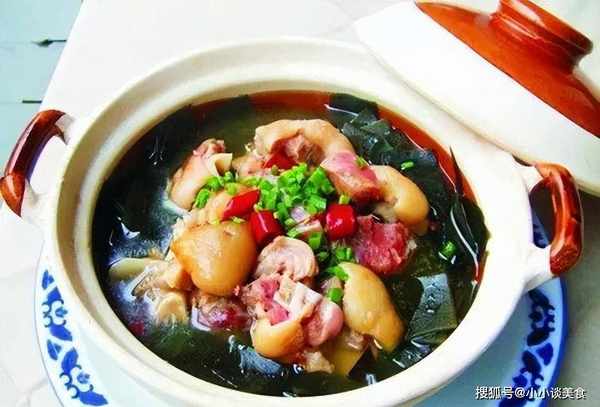 5、豬腳放入鍋內,加入清水適用量,放在火上燒開,煮約半小時,撇凈浮沫,加入香菇、薑絲、精鹽,用小火燉20分鐘,再放入絲瓜、豆腐,燉至豬腳熟爛後,加入味精調味即可