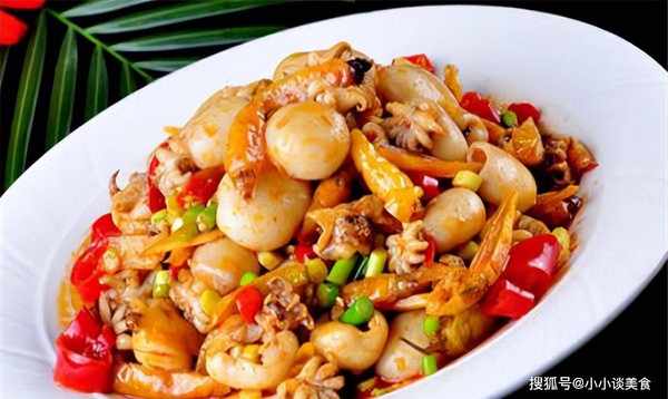 2、青豆、胡蘿卜丁、青菜洗凈後入炒鍋炒五成熟;蝦仁和幹貝丁下油鍋滑炒至六成熟。