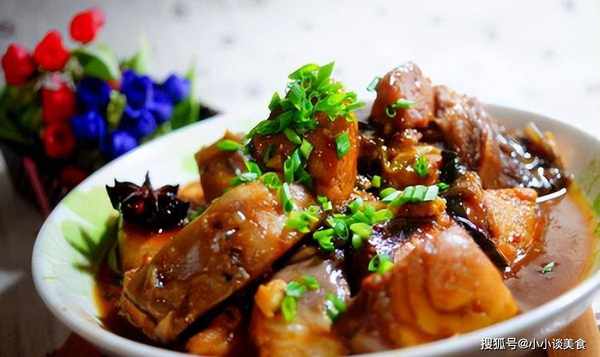 4、在把炸過的肘子下鍋燒一會兒後,改大火直至鍋裡的湯汁收幹,往鍋裡淋入花椒油和香油,撒入青紅美人椒段翻勻,起鍋裝盤時,撒些蔥花便好。