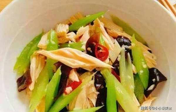 材料:腐竹、黑木耳、水芹菜、紅椒、蒜、紅椒、鹽、油、雞精。