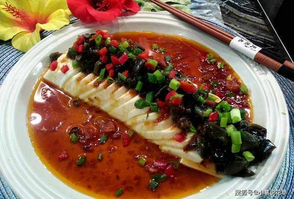 6.蒸好的豆腐撒上適量的紅辣椒和蔥花,然後把煮好的醬汁淋上豆腐上即可。