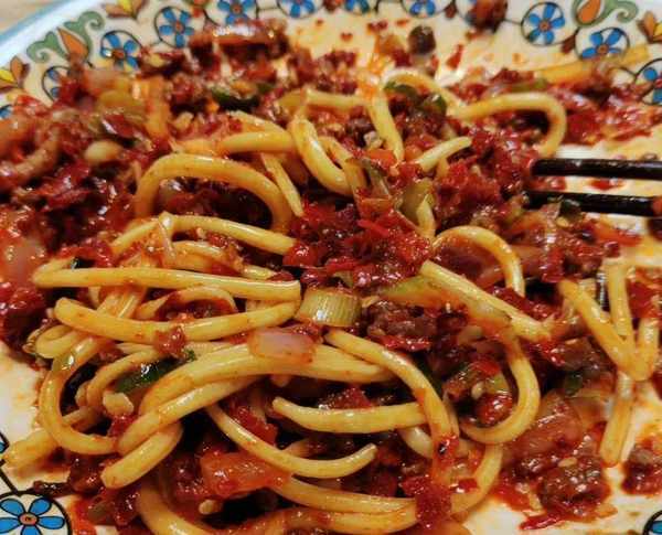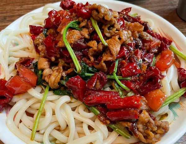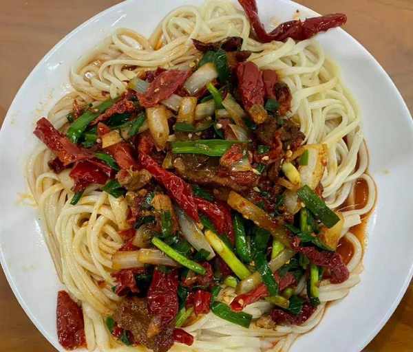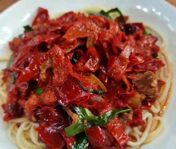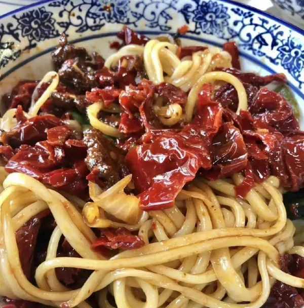 辣皮子拌面裡的幹紅辣椒在經過和肉的炒制後,幹幹的辣椒也變得軟塌塌的,而且辣椒也充分吸收瞭湯汁的濃香,吃起來竟然是種獨特的美味,說是比肉好吃也不是為過的。