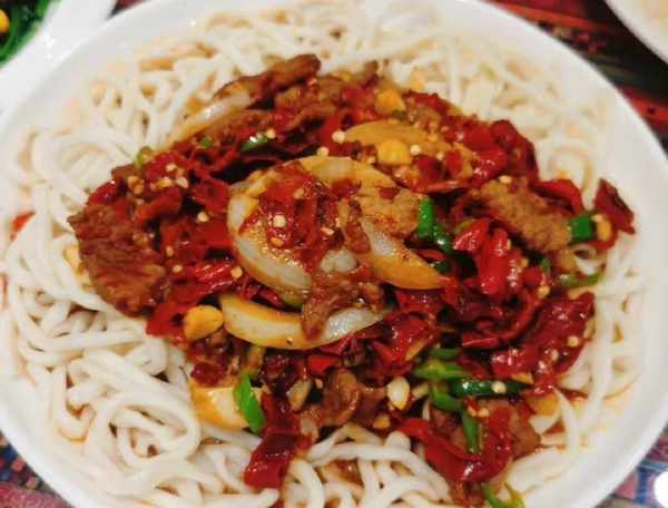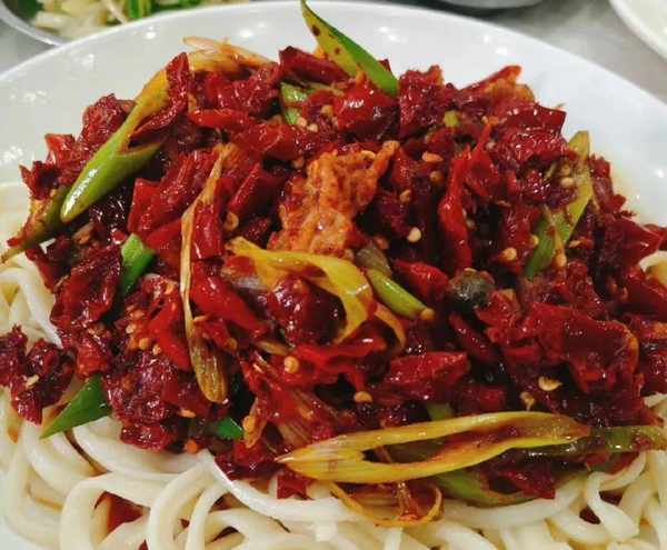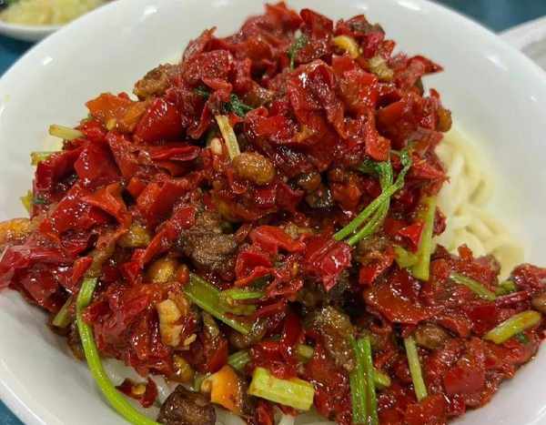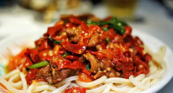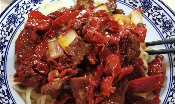 將火紅的幹辣椒當作是菜一樣和牛羊肉炒制以後,和勁道爽滑的拉條子拌起來吃,氣質真的是太棒瞭,尤其是辣椒的氣質更加地出彩,甚至比肉更加的驚艷,讓人無法忘記的美味!
