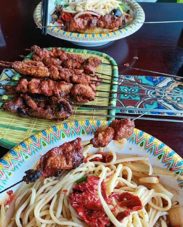 辣皮子拌面本來吃得就已經很過癮瞭。如果再加入幾串新疆烤肉的話,那真的是太完美,太享受瞭!