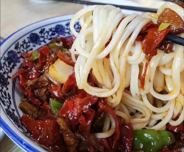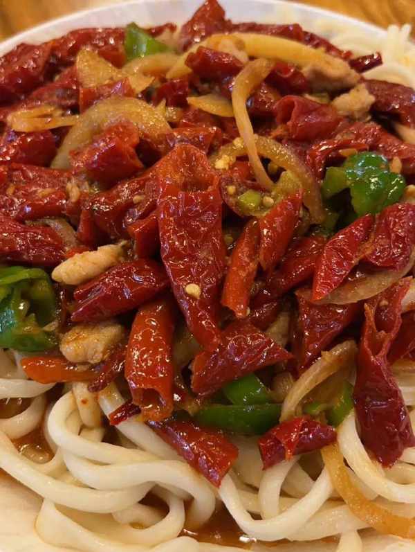 被紅色辣椒包裹起來的拉條子,有種新疆炒米粉的顏值和感覺,那火紅的顏色和濃鬱的氣質,真是讓人愛到骨子裡瞭!
