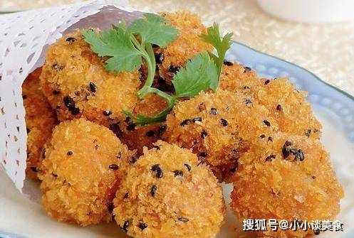 4.鍋裡放油燒熱。油熱後,加入小丸子,炸5分鐘。炸好後撈出瀝幹油。用紙吸幹油並立即食用。