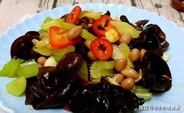 幹木耳20克、花生150克、芹菜4粒、紅辣椒半個、青椒半個、蒜頭4瓣、生抽2湯匙、米醋2湯匙、糖2茶匙、花椒油2茶匙、花椒油2茶匙香油、鹽半茶匙。