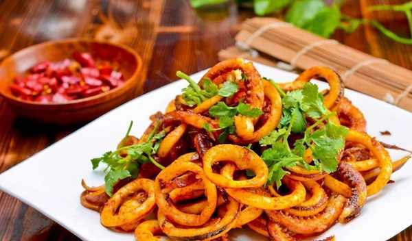 材料:魷魚1條,甜面醬3湯匙,蔥絲5克,薑三片,香菜末5克,鹽1/4茶匙,白糖1/2茶匙,料酒1湯匙,油1勺