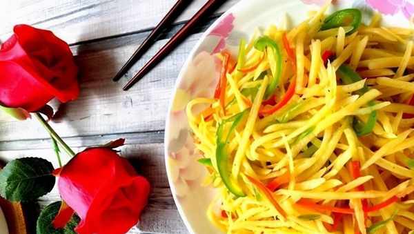 食材:土豆80g、青椒20g、胡蘿卜10g油1勺、鹽2g、醋少許、花椒粉2g