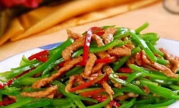 材料:青尖椒、豬肉、薑、淀粉、食用油、鹽、雞精、醬油、豆瓣醬
