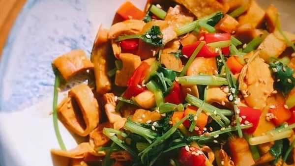 材料:杏鮑菇胡蘿卜花生米紅椒豆筍面筋芹菜薑末