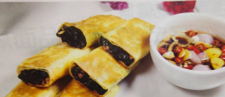 3.蛋皮包入餡料150克/個,用不粘鍋煎至兩面金黃,搭配碗自制蘸料上桌即可。