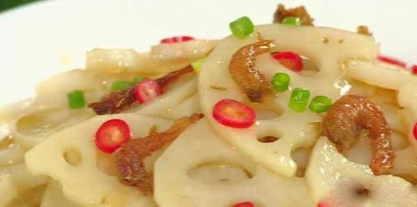 5、鍋中放入油,下入幹蝦米、蔥段,炸至蔥段焦香,然後將蔥油澆於藕片之上,拌勻,品嘗即可。