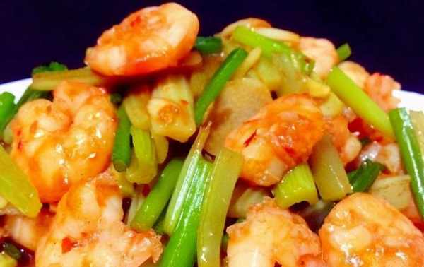 食材配料:蝦,芹菜,蒜苔,蔥,薑,蒜,油,鹽,料酒,醋,醬油
