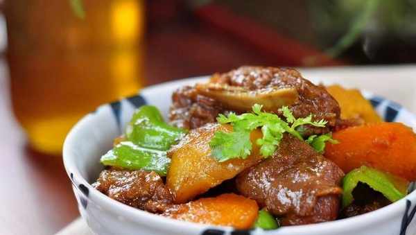 食材:牛仔骨800g土豆2個胡蘿卜1根青椒2個鹽適量薑2塊生抽1湯匙牛肉醬1湯匙幹辣椒8個蔥1段八角2個老抽1/2湯匙