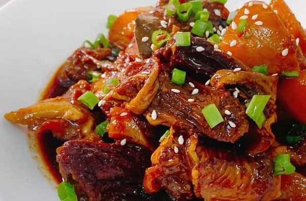 7、放入牛仔骨,煸炒出水分,肉微黃。