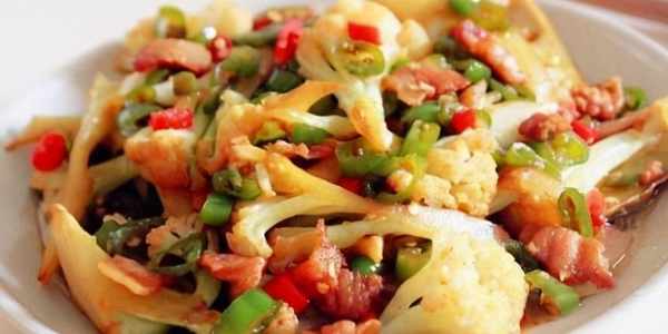 材料:菜花;五花肉;青尖椒;朝天椒;薑;蒜;鹽;生抽;雞精;白糖;
