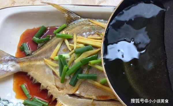 第四步:放上新的蔥薑,澆上蒸魚豉油,然後鍋中燒熱適量的油,將熱油澆到魚身上,我們的清蒸鯧魚就做好瞭。