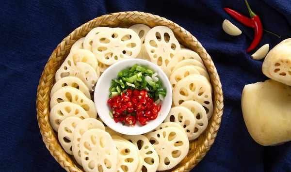 【涼拌藕片】用料:蓮藕、蔥薑蒜、幹辣椒、鹽、白糖、雞精、白醋、香油