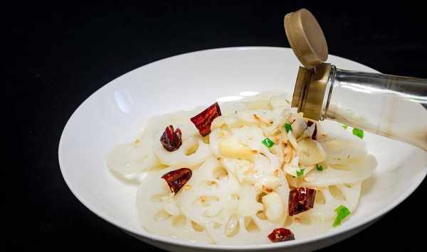 4、把蔥薑蒜、幹辣椒這些全部倒在蓮藕中,然後再往藕片中加上一定量的鹽、白糖、雞精、白醋和香油,拌勻後即可食用。