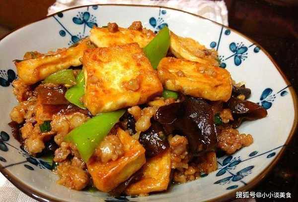 肉末100克、豆腐1塊、青椒1個、香菇3朵、青蒜半瓣、大蒜2瓣、黃酒(醬)1茶匙、蠔油(醬)2茶匙、3醬油茶匙、雞湯(醬)1茶匙、水淀粉適量