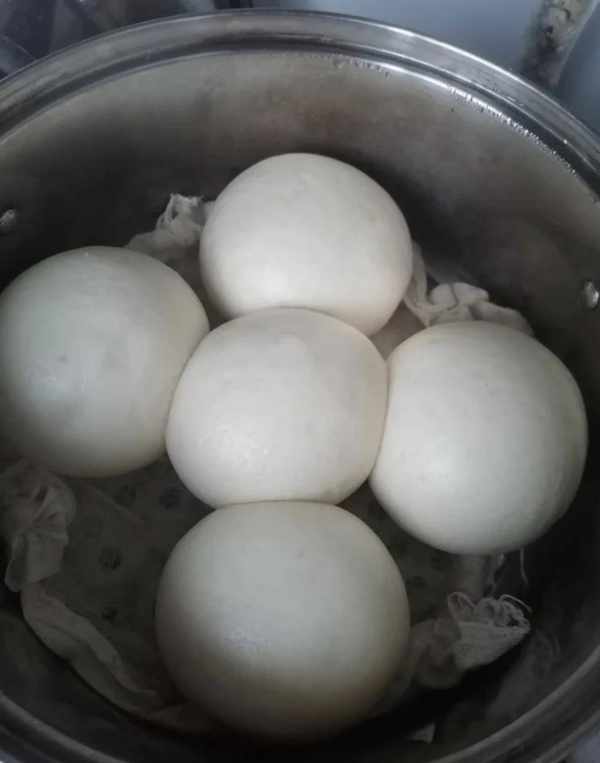 5、案板上撒上面粉,將面團放在案板上,分成等份。用手將每個面團搓成圓形。包子放在蒸簾上蒸十分鐘。