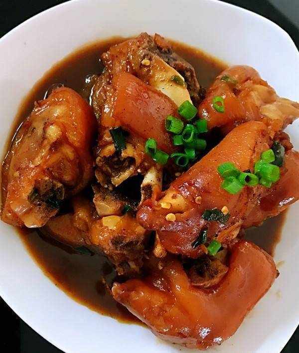 材料:豬手2個,冰糖,油,老抽,生抽,蔥,薑,蒜,八角1個,桂皮1小塊,胡椒粉。