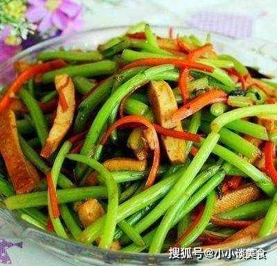 4.加入菊花莖炒香。當蔬菜半熟時,加入醬油和鹽,然後從鍋中煮熟。