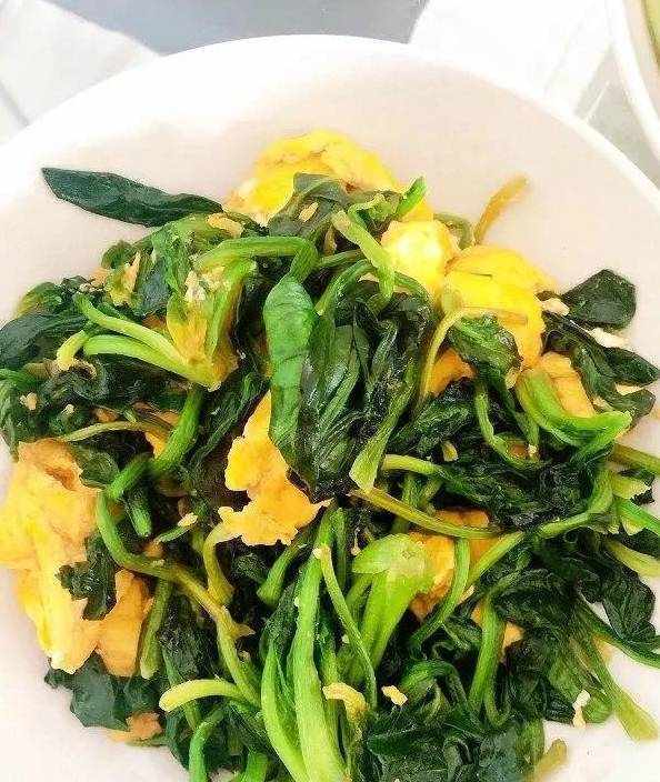 3.鍋中下油10克,大火燒熱,用蔥薑蒜爆炒;加入菠菜,放鹽、雞粉、胡椒粉;放入炒好的雞蛋,大火翻炒幾下,淋香油出鍋。