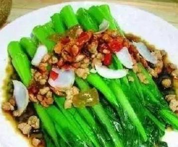 材料:菜心、豬肉餡、醬油、蔥、薑、蒜、料酒、香油、豆豉、白胡椒