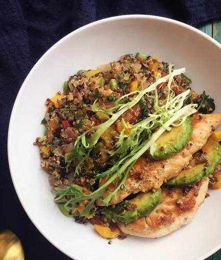 材料:牛油果1個;藜麥1/2杯;水1-1.5杯;番茄2個;洋蔥;雞心椒;黑豆;香菜;玉米;孜然;辣椒粉;鹽;黑胡椒;雞精