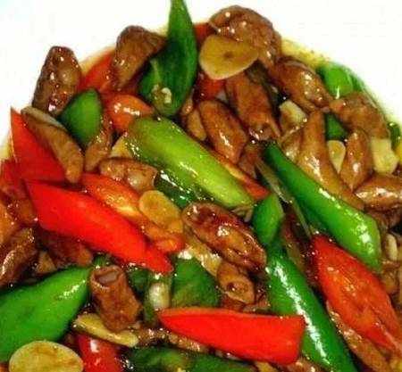 3、鍋內少許底油,加薑絲,蒜瓣,幹辣椒爆香鍋底。倒入洋蔥煸炒片刻出香味,加入炸好的豬肝片,加入2勺醬油翻炒1分鐘,1勺蠔油,少量的鹽和糖調味,倒入小蔥段大火翻炒2分鐘。